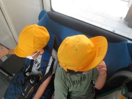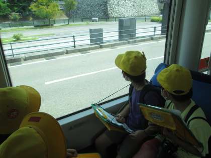 市内電車の中での様子です。初めて電車に乗る子どもも多く、外の風景や、車内の様子に興味津々でした。隣の車両には中学生が、乗っていたのですが、自分たちで料金を払う姿に感動していました。次乗るときは、自分で運賃を払えるようになるとよいですね。