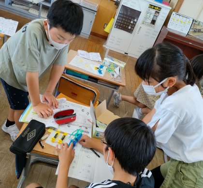 1組では、理科の学習で、乾電池とモーターを繋いでプロペラを回していました。うまく繋げないときは、友達同士で助け合っています。