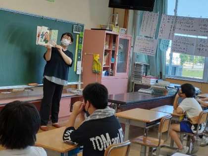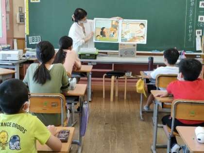 登校するだけで汗びっしょりになった子供たちは、ちょうど冷房が効き始めた心地のよい教室で、お話に聞き入っていました。