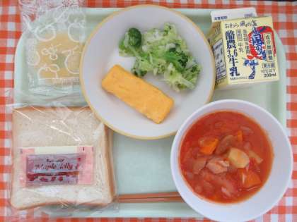 今日は、トマトの味を生かした煮込み料理です。野菜もたっぷりで栄養満点です。味わって食べましょう。