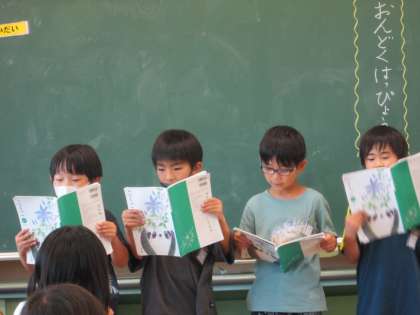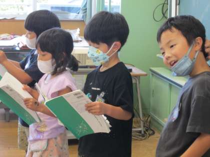 学習のまとめとして音読発表会では、グループごとに工夫した音読を披露しました。発表会の後、それぞれのグループの音読のよさを伝え合いました。