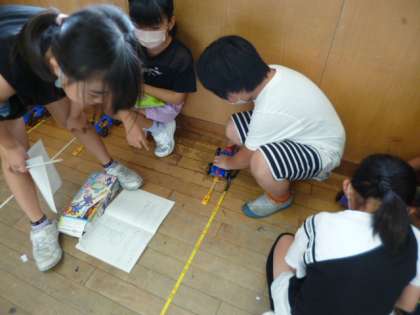 理科では、風のはたらきの実験に引き続き、ゴムのはたらきの実験を行いました。班ごとに協力して実験しました。