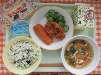 あとは、共通のわかめごはん、キュウリもみ、沢煮椀、牛乳です。