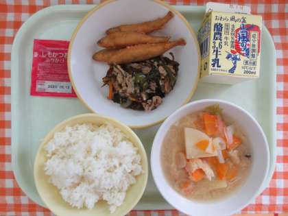 今日の献立は、ごはん、もずくのチャプチェ、ワカサギのフリッター、具だくさん汁、しそ鰹ふりかけ、牛乳です。