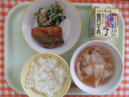 今日の献立は、ごはん、サバの竜田揚げ、梅肉和え、ワンタンスープ、牛乳です。