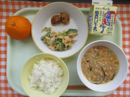 今日の献立は、ごはん、冬瓜のそぼろあん、ホタテの照り焼き、ベーコンとゴーヤの卵炒め、冷凍みかん、牛乳です。