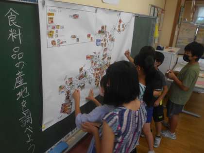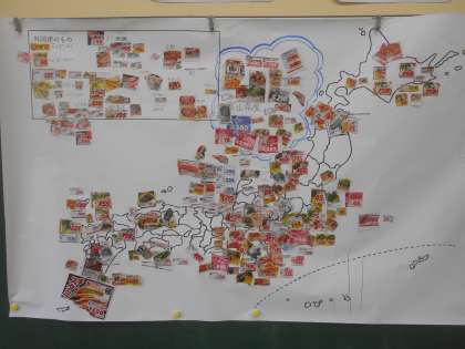 自宅からスーパーマーケット等のちらしを持ち寄り、食品の産地を調べて日本地図上に貼りました。