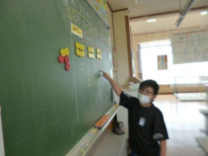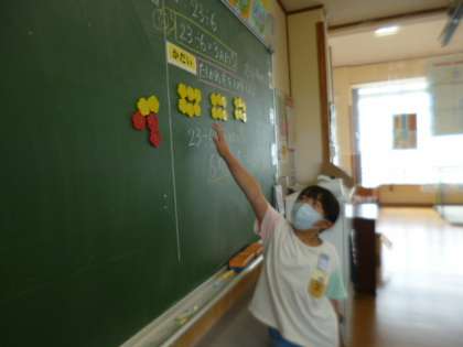 算数の授業の様子です。友達に分かりやすく伝えることを繰り返し学習してきました。今では、自然にみんなの方に体を向け、注目してほしいところを指しながら話すことができるようになってきました。3年生になってから、よりレベルアップしたことの1つですね。