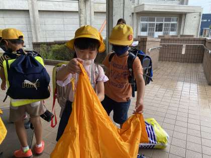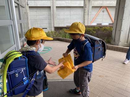 下校しようと思ったら、雨が、、、。1年生のランドセルからカッパを取り出して、「手伝うよ」と声をかけている2年生がいました。お兄さん、お姉さんとしてのかっこいい姿を見ることができました。