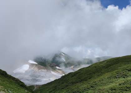 室堂につきました。天気も景色も最高です。周辺を散策して、みくりが池や地獄谷の説明を聞きました。