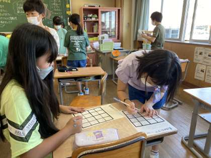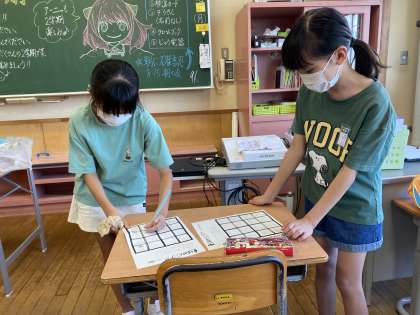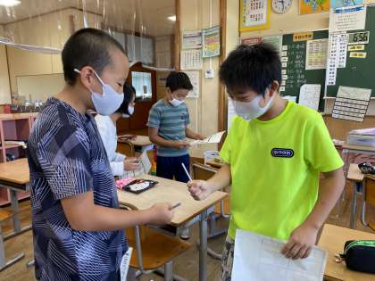 「夏休みビンゴ」を通じて、スイカは食べた?ラジオ体操は行った?など、簡単な質問をしながら夏休みの思い出を語りました。夏休みと気持ちを切り替え、5年生の2学期は、6年生に向かって力を合わせて多くの活動をしていきます。子供たちを温かく見守っていただけると幸いです。よろしくお願いします。