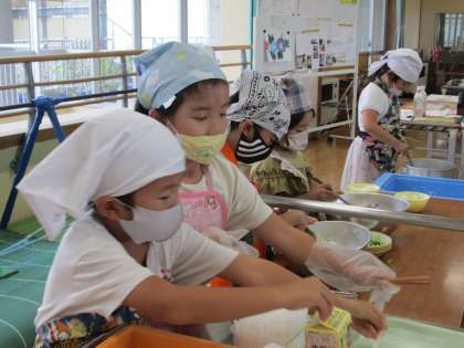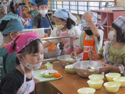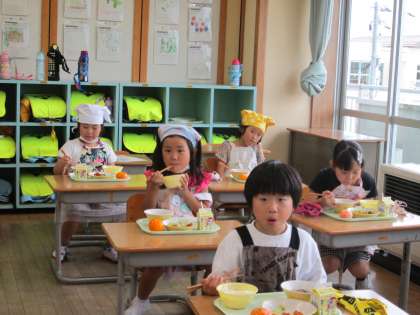 黙食だけれど、みんなと一緒にたべる栄養満点の給食。おなかぺこぺこの子供たちにとって、最高の楽しみの時間です。