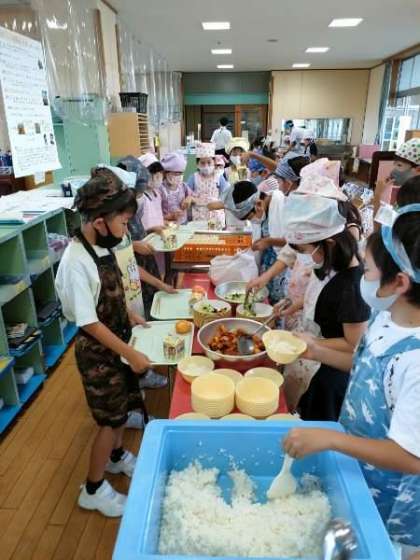 今日から、大好きな給食が始まりました。子供たちは、張り切って準備を行い、たくさんおかわりをしてお腹いっぱいになりました。2学期も、感謝しながら美味しい給食をいただきます。