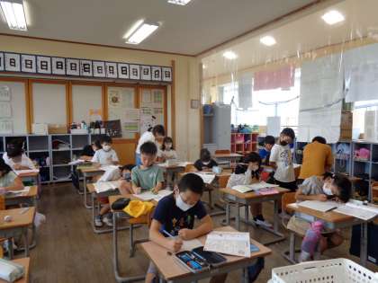 算数の様子です。教科書の問題に取り組みました。すべて○をもらえた子供は、率先してわからない子に教えていました。自然とたすけあいができていて素晴らしかったです。