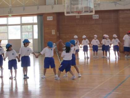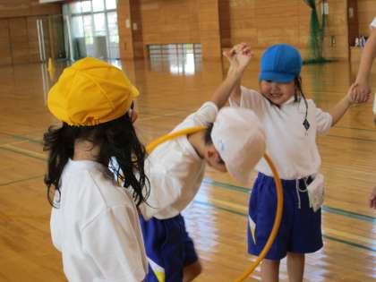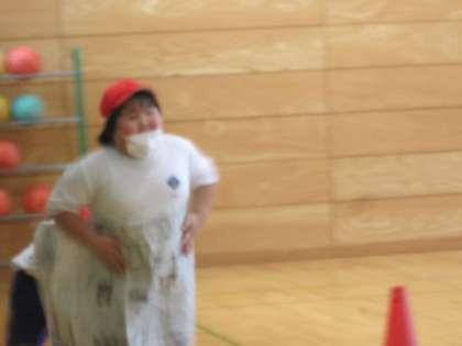 団の仲間と協力してフラフープ送りをしたり、新聞紙を落とさないように力いっぱい走ってリレーをしたりしました。声をかけ合いながら、みんなで楽しく取り組むことができました。