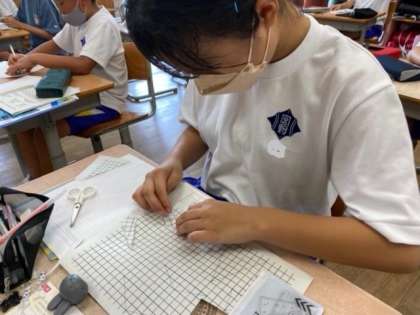 「三角形の内角の和は180°になる」ことを分度器を使って測ってみたり、角を合わせて180°の直線になうのか試したりしました。どんな三角形でも180°になることに驚いている子どもがたくさんいました。