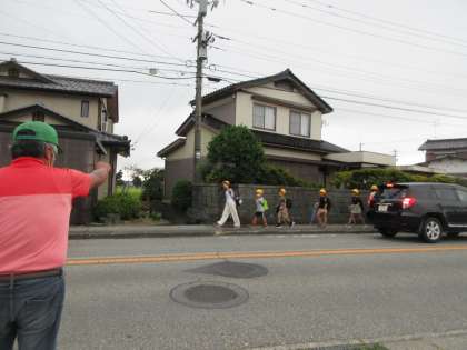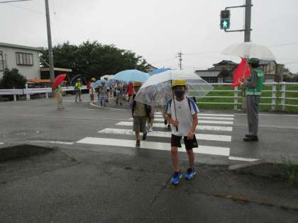 交通指導員さんや、PTAの交通指導担当の方々が、雨にもかかわらず、横断歩道に立ってくださったり、いっしょに歩いてくださったりしています。