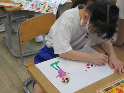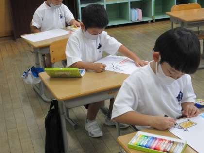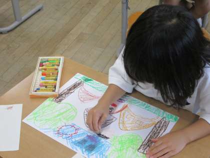 「夏休みにしたことや心に残ったこを絵にかいてえよう」と、今日はクレヨンを使って描きました。次の時間には、水彩絵の具でも彩色して完成させる予定です。