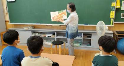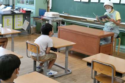 二学期も、朝の読み聞かせが始まりました。今日は、1・2年生と、のぞみ・あおぞら級でした。「パンどろぼうvsにせパンどろぼう」「ねこの子ジョン」「にわとりのおっぱい」「ぼくだんごむし」「あたしのやまのぼり」の絵本を読んでいだきました。