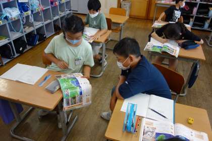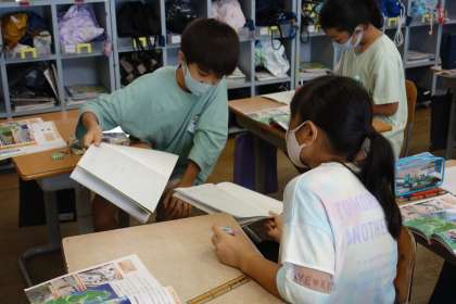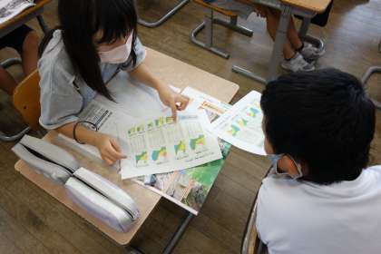 資料を基に富山県でこれまでに起きた自然災害について調べてみると、過去には様々なタイプの災害があった事実を知りました。予想とは少し違う事実に驚く子供たちでした。今後の災害予測の資料も合わせて読み取っていくと、危機感を感じているようでした。