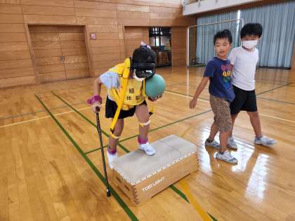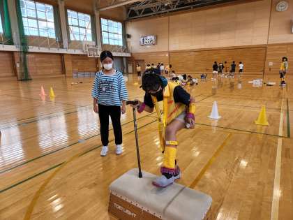 高齢者体験キットを装着して、決められた道を歩いたり、段差を上り下りしたり、床に落ちている物を拾ったりしました。