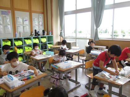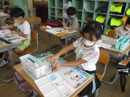 今日は、水彩絵の具で色をつけました。筆をシュッシュッと動かしたり、トントンしたりしながら、思い思いの表現を楽しみました。
