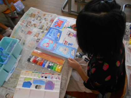 図工科の学習では、クレヨンと水彩絵の具を使って、「夏休みにしたこと」を絵に描きました。画用紙いっぱいに自分の思い出を描き、うまくいかないところは、「ここはどうしたら良いと思う?」と積極的にお友達に聞いたり、先生に聞いたりして、良い作品を仕上げようと頑張っていました。