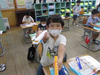 「10のまとまりと いくつ」を意識して、20までの数をブロックでつくったり、書いたりしました。みんなで声をそろえて、20までの数を調子よく唱えることができました。