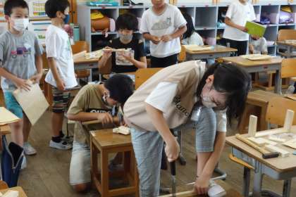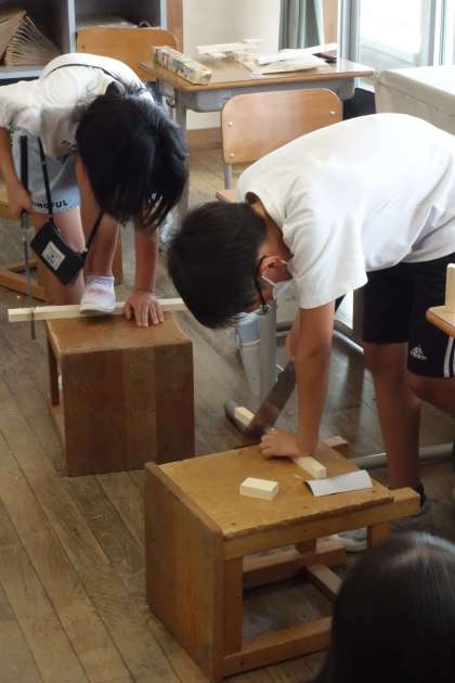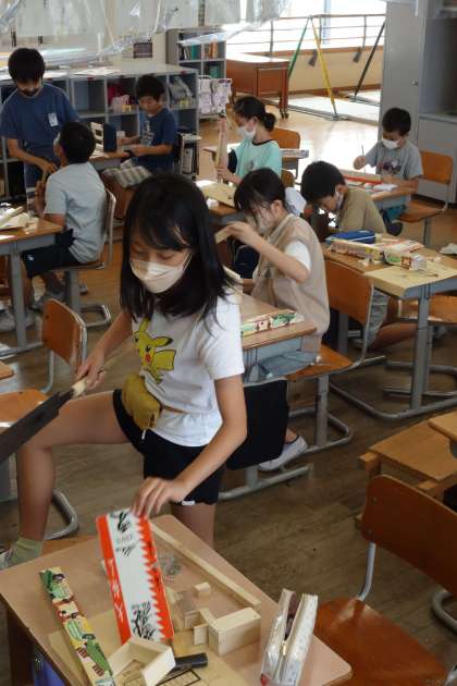 今日は、のこぎりで切る作業を終え、玄翁で釘打ちする段階に移った子供が増えました。どんどん作品が仕上がってきています。