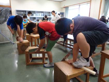 図工では、のこぎりを使っています。