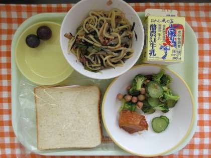 今日の献立は、減量食パン、照り焼きチキン、ビーンズサラダ、ベーコンとひじきの和風スパゲッティー、巨峰、牛乳です。
