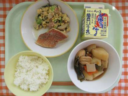 今日の献立は、ごはん、赤魚の塩焼き、卵ときくらげの炒め物、炊き合わせ、牛乳です。