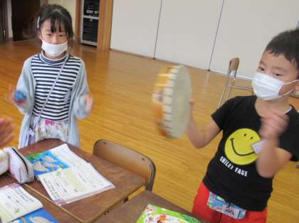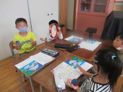 今日の音楽では「いるかはざんぶらこ」の3拍子に合わせてリズムをうちました。手拍子や楽器で楽しくリズムをうちました。