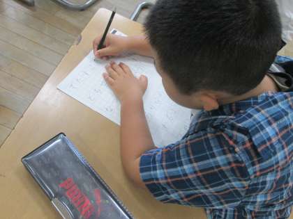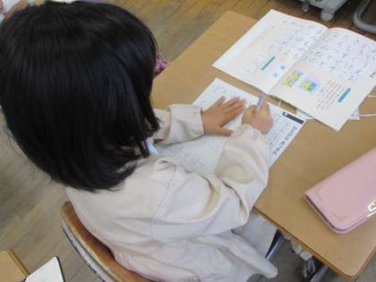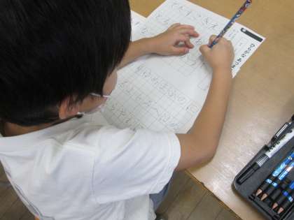 書写の学習では、1学期に学習したひらがなを正しく書く練習をしました。間違えやすい「とめ、はね、はらい」に注意して正しく書こうとがんばりました。姿勢を正してていねいに書くことができました。