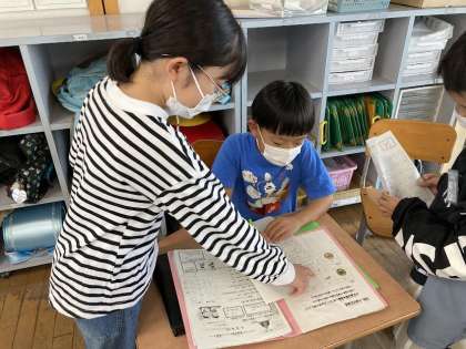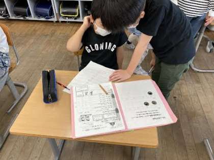 宮野っ子検定の直しをしました。分からないところを「教えて」と自分から言うことができる子供たちです。素敵な姿です。また、教えている子供たちも、答えをすぐ言うのではなく、どの部分が難しいかを聞き取り、ヒントをあげています。みんなでトライアングル賞をとれるように、がんばりましょうね。