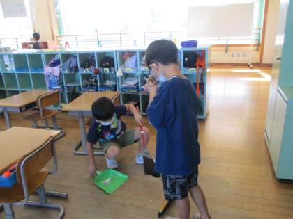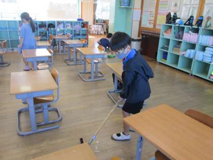 図画工作科の学習の後、教室の床に残っていた紙の切れ端を、きれいに掃除している素敵な1年生の姿がありました。