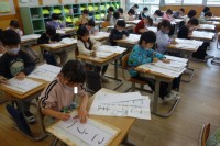今日は、画用紙いっぱいにクレヨンで自分の似顔絵を描き、1学期に作成した「とんがりぼうし」と合わせて1つの作品を完成させました。「秋だからハロウィンみたい。」と季節ならではの言葉も出てきて、楽しそうな1年生でした。