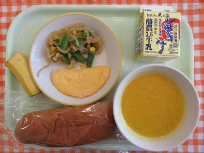 今日の献立は、黒糖コッペパン、オムレツ、アスパラサラダ、かぼちゃポタージュ、バナナ、牛乳です。