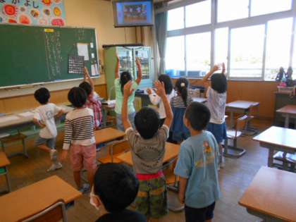 「わくわくトレーニング」の様子です。テレビを見ながら動きを真似して楽しく体を動かしました。