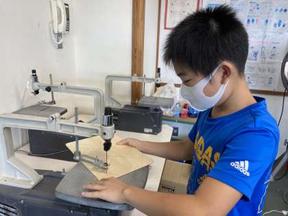 初めて糸のこを使いました。押さえる手や手前から奥に押していくことを意識して安全に糸のこを使いました。パズル作りも完成が見えてきました。