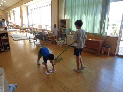 本日の縦割り清掃の様子です。ご覧ください、この雑巾がけ。なんと綺麗な姿勢なんでしょう。他学年と協力し、掃除に専念することができました。