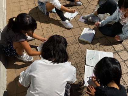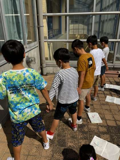 かげの観察をしていると、「ひとうつ、ふたあつ、みいっつ・・・」と声が。いつの間にかかげおくりが始まりました。「ちいちゃんのかげおくり」を何度も音読した子供たち。登場人物の会話文もばっちり覚えていました。ちいちゃんのように、いろいろなポーズのかげおくりを楽しみました。