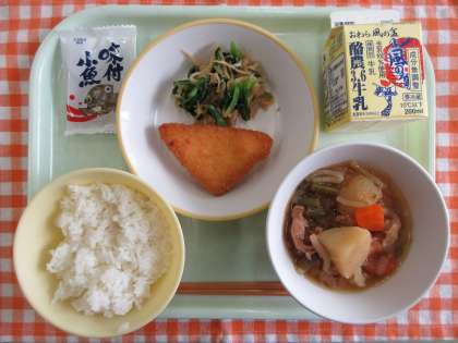 今日の献立は、ごはん、はんぺんフライ、はりはり和え、肉じゃが、味付け小魚、牛乳です。