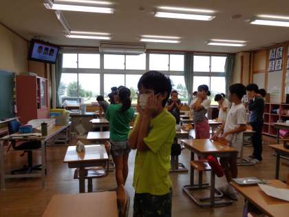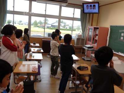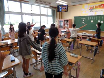 朝にげんキッズハーモニーが、業間にわくわくトレーニングが、校内テレビ放送で行われました。テレビを見ながら歌ったり体を動かしたりしました。