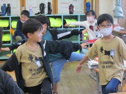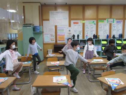 今日は、片足立ちをしました。教室の中でもできる簡単な運動です。これからも、ちょっとした時間に取り組んで、体つくりにつなげていきます。