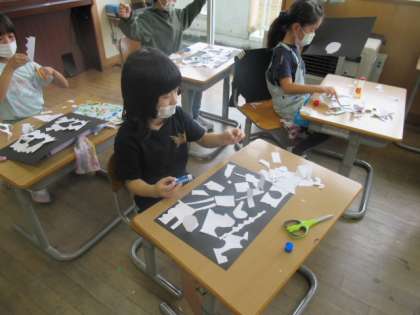 今日の図画工作科の学習で、はさみで画用紙を思い思いに切り、切った形を合わせて作品を作りました。