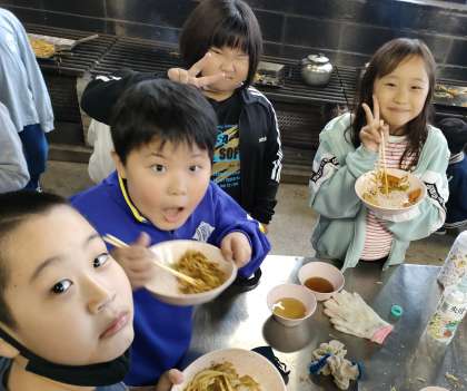 美味しい焼きそばが、あっという間に出来上がりました。さっき朝ごはんを食べたばかりなのに、たくさんの子供たちが、おかわりをして食べています。自分たちでつくった焼きそばは、格別のようです。