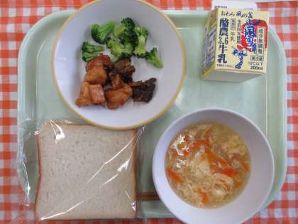 今日の献立は、食パン、鶏肉とレバーのマーマレードソースからめ、ゆでブロッコリー、コーンと卵のスープ、牛乳です。