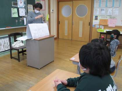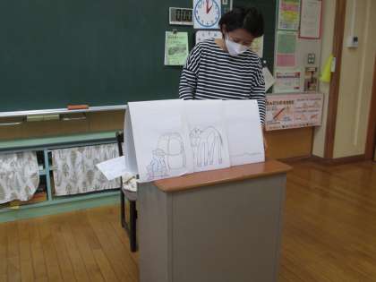 手作り絵本で読み聞かせをしていただきました。どんなお話か真剣に聞いています。