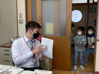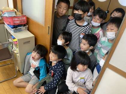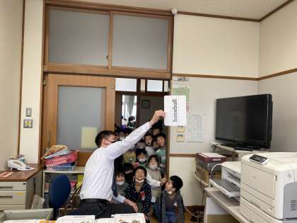 職員室の扉からALTの先生と話していた数名の子供たち。それを見ていた1年生がたくさん集まってきました。英語とALTの先生に興味津々です。